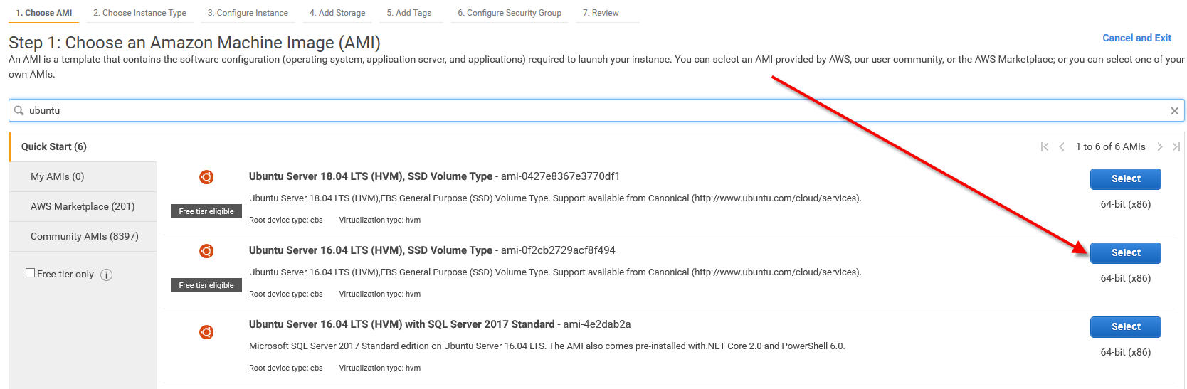 In the search box, search for Ubuntu, then select the 16.04 with SSD option: