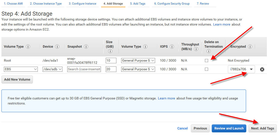 Make Root 10GB and add a second volume for /opt and ensure it is encrypted. It is recommended that you deselect "delete on termination" for your volumes so the volume will still exist if you accidentally delete your instance.