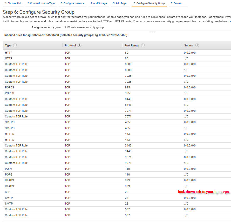 Below are all the ports required for Zimbra in a security group: